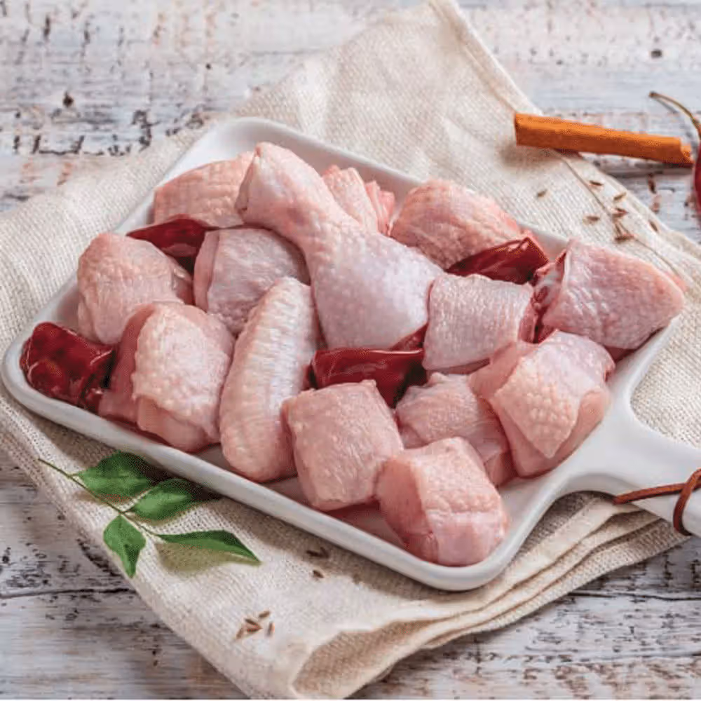Chicken biryani cut with skin processed under hygienic conditions.